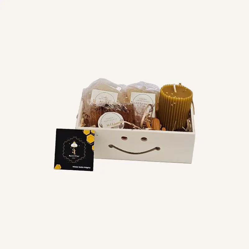 Cesta aromática: Vela lata, bálsamo labial, crema manos solida y bolsa aromática.